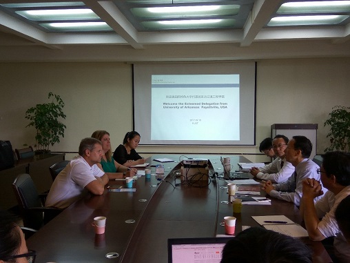 院长何民介绍了学院的专业设置、学科方向、科学研究等基本情况以及物流工程专业情况。Karen Boston博士介绍了美国阿肯色大学山姆沃顿商学院的相关情况。合作洽谈会上,双方就物流工程专业本科生联合培养的课程设置、教学大纲和教学方式等相关事宜进行了详细的商谈,并就具体问题达成了合作共识。