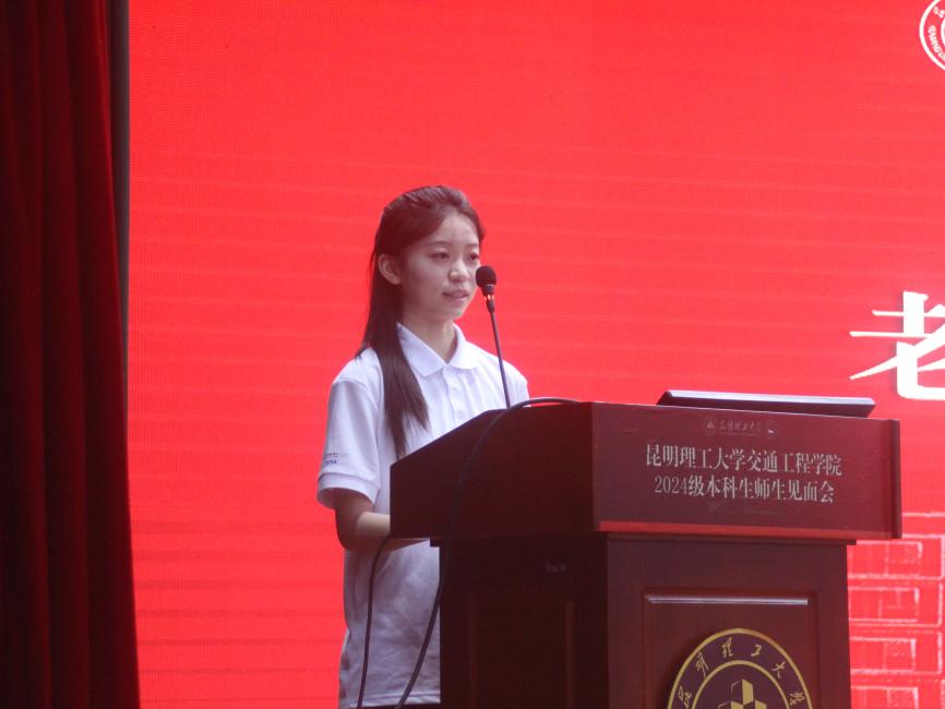 车辆工程221班王芯蕊同学作为老生代表发言。她以“铸就未来:探索成长的无限可能”为题向2024级全体新生分享了她的在校感受和收获,以一名“过来人”的身份向新生们传授了大学生活应该怎样度过。她相信,保持终身学习的态度,“多思考炼心智,用行动拥抱答案之美”,才能在规划未来时明晰方向。