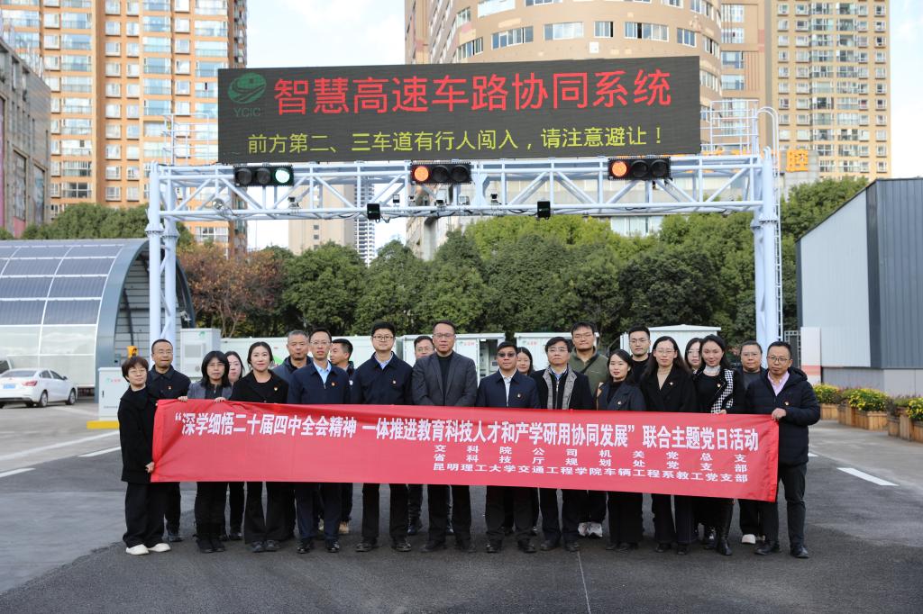 为深入学习贯彻党的二十届四中全会精神,扎实推进教育、科技、人才一体化发展,2025年12月19日,学院车辆工程系教工党支部联合云南省省科技厅规划处党支部、云南省交通科学研究院有限公司机关党总支,在云交科智慧交通科创产业园开展“深学细悟党的二十届四中全会精神 一体推进教育科技人才和产学研协同发展”主题党日活动。活动采取实地观摩与专题研讨相结合的形式,共同学习党的创新理论,深入交流科技创新实践经验,共谋协同发展新路径。