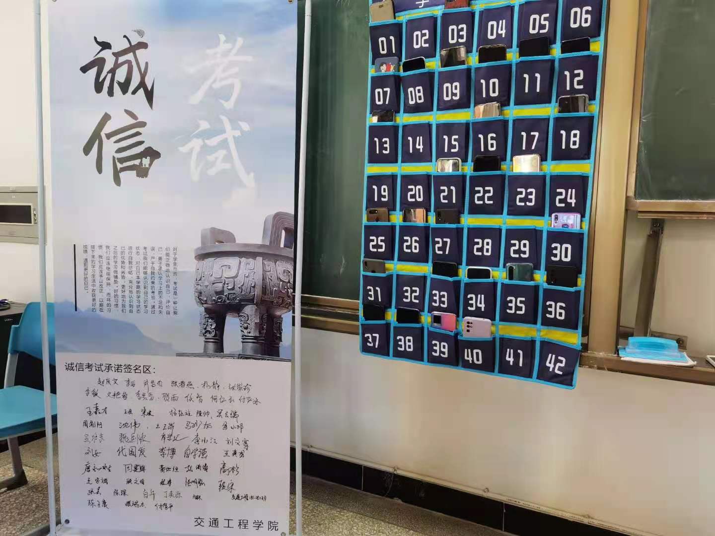 在无人监考考场中,讲台一侧立有带所有考生签名的《诚信考试承诺书》,同时讲台上还设有手机袋方便同学们考试前放置手机。考试过程井然有序,同学们按照《独播库