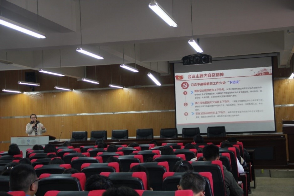 团委负责人晁洁同志主讲,从坚持中国特色社会主义教育发展道路和做德智体美劳全面发展的社会主义建设者和接班人两个方面进行讲解。