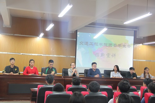 团委学生会招新活动在交通楼A402教室圆满举行。出席本次活动的有交通院辅导员晁洁老师,寸议鹏老师,学生会主席王天宇、团委副书记张婷、学生会副主席唐佳桃、谢卫金、彭大利、副主席兼社团管理部部长谭玲,以及独播库