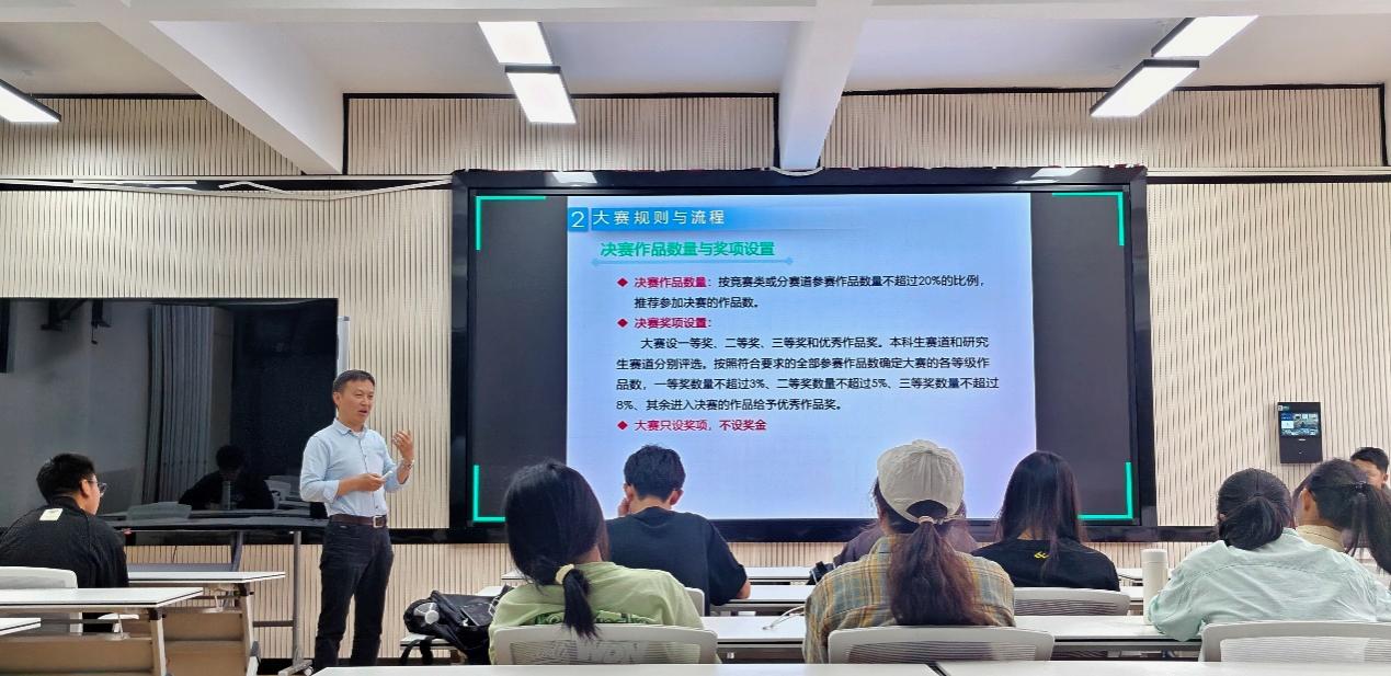 随后,贾现广老师结合自身多年指导学生参加“全国大学生交通运输科技大赛”的丰富经验,向同学们详细解读了比赛赛制,并通过典型案例分析向同学们展示了优秀作品的创新要素和评审要点,带领同学们共同深入剖析了选题策略、方案设计,材料撰写等关键环节的注意事项,为同学们提供了可操作的备赛指南。