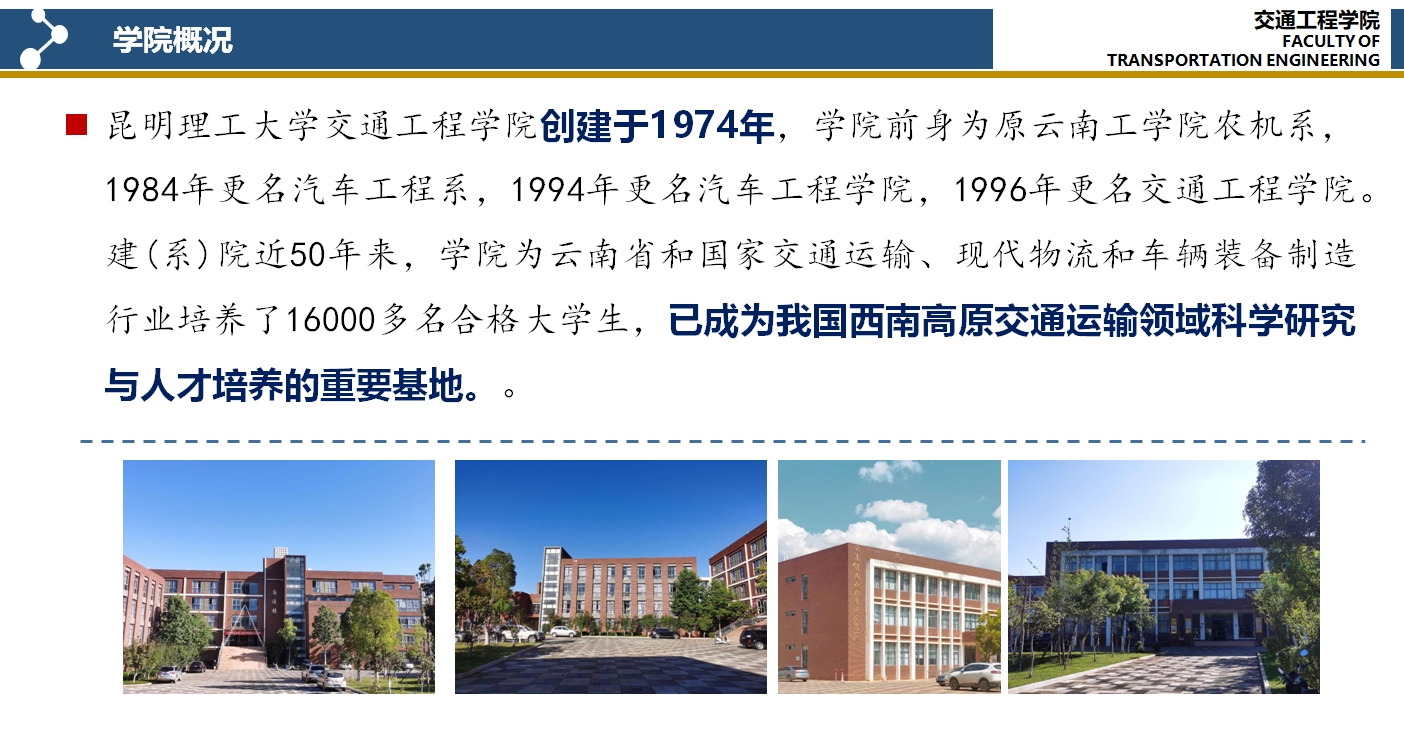 独播库 创建于1974年,学院前身为原云南工学院汽车系。学院在新迎校区奠基,在白龙校区成长,在呈贡校区壮大。学院经过40多年的发展,形成了完备的学科体系,拥有交通运输工程一级学科博士和硕士学位授权点、车辆工程二级学科博士和硕士学位授权点、动力机械及工程二级学科硕士学位授权点,同时具备交通运输工程领域工程硕士授权资格。在本科生培养方面,学院现有交通工程、交通运输、物流工程、车辆工程四个本科专业和物流工程(中外合作办学)专业。交通工程专业于2017年通过工程教育专业认证,2019年获批国家级一流本科专业建设;车辆工程专业于2018年通过工程教育专业认证,是教育部首批新工科实践与探索项目专业,2019年获批省级一流本科专业建设;物流工程专业是云南省重点产业引领品牌专业、教育部批准的中外合作办学项目;交通运输专业是云南省本科综合改革试点专业。